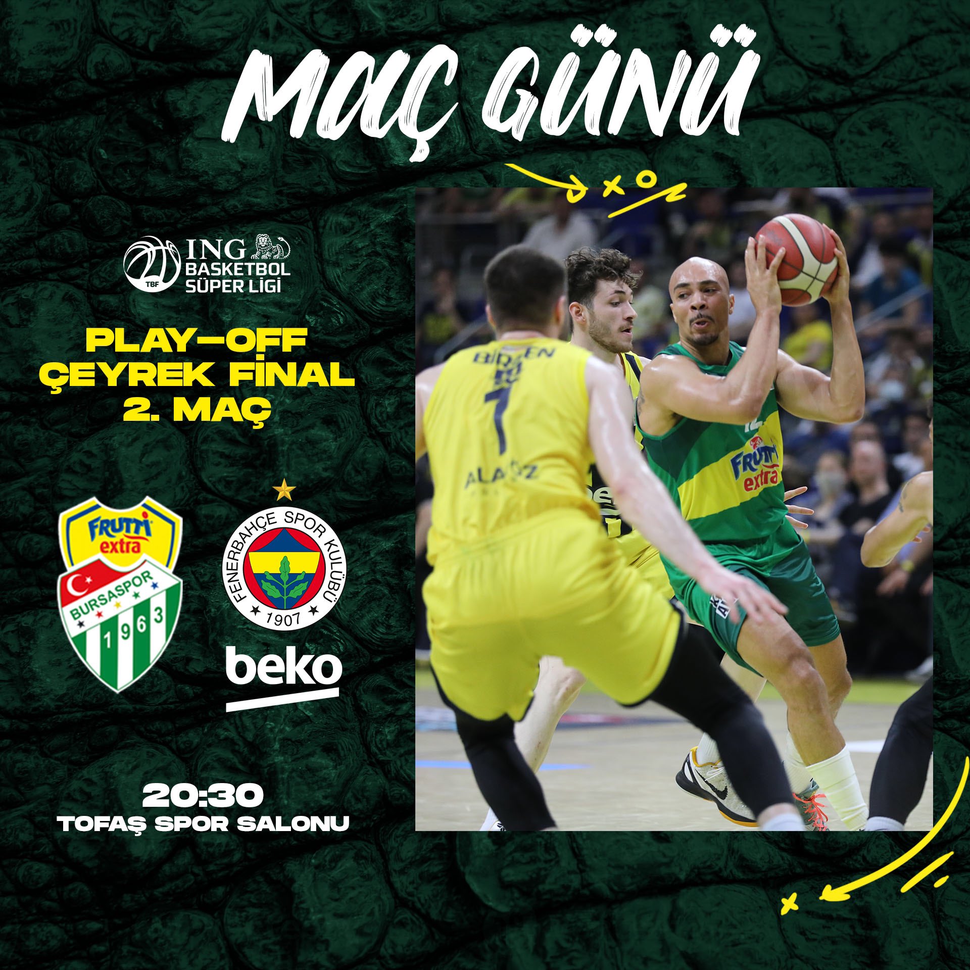 Frutti Extra Bursaspor, ING Basketbol Süper Ligi’ni bu sene 8’inci basamakta tamamladı. Bu başarısı sayesinde lig lideri Fenerbahçe Beko ile çeyrek finalde karşılaşma şansı buldular. Kulüp Fenerbahçe Beko maçıyla beraber ilk kez play-off deneyimi yaşıyor. Fakat onlar için bu sene asıl etkileyici olan, ilk kez dahil oldukları EuroCup’ta finale kadar tırmanmış olmaları. Bursaspor, Avrupa’nın yüksek bütçeli ekiplerinden biri olan Virtus Bologna’ya finalde kaybederek EuroCup’ın ikincisi oldu. Fenerbahçe Beko ile Ülker Spor ve Etkinlik Salonu’nda oynanan ilk maçta Onuralp, attığı 18 sayı ile yıldızlaştı. Onuralp’in yanında Needham ve Holland da toplamda 31 sayılık katkı yaptı. Takımın bir numaralı skor opsiyonu olan Andrews’in bu maçta biraz daha etkili olması bekleniyor.